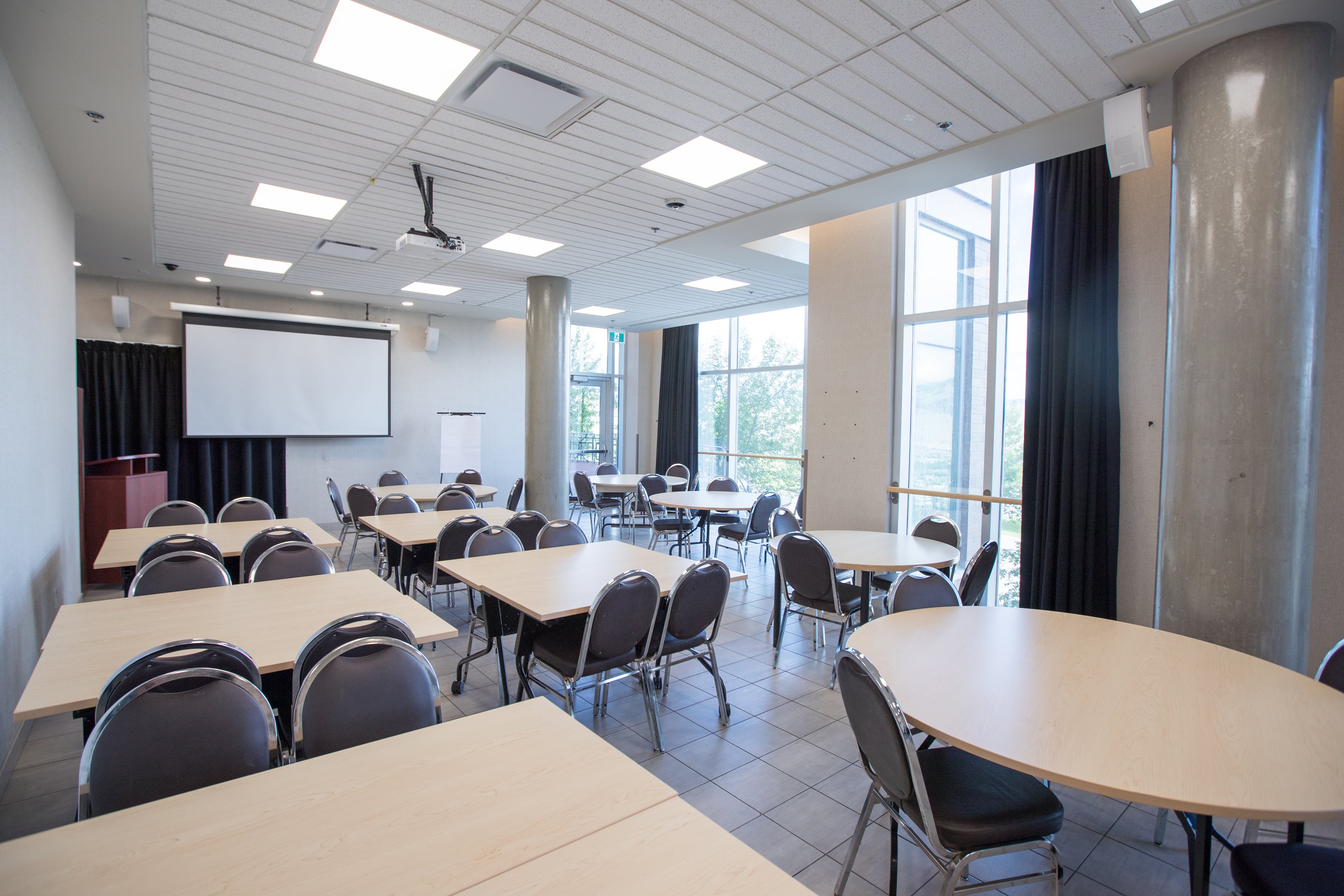 This versatile space is located on the first floor of The Residence & Conference Centre. Floor to ceiling windows provide natural light and a great view of city. This room also has access to a large brick patio for guests to soak up the Kamloops sunshine during breaks. Ideal for meetings, social gatherings, sports groups or interactive workshops.