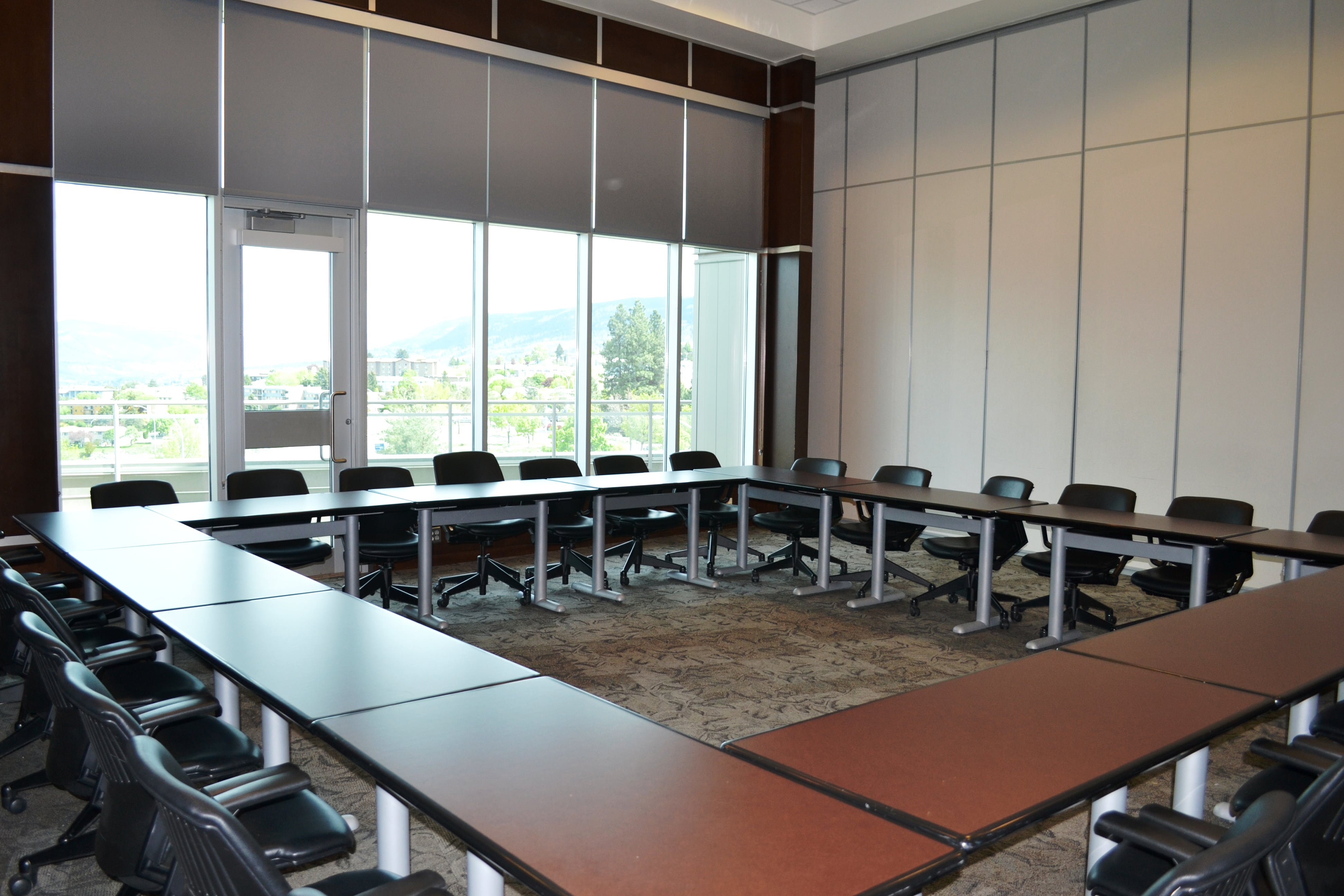 Located in the center of campus, this versatile event space has the ability to be sectioned into three smaller rooms. Warm wood tones and natural light from the oversized windows add plenty of warmth to the space. Guests can also enjoy the amazing view of the Kamloops valley off the private patio.
