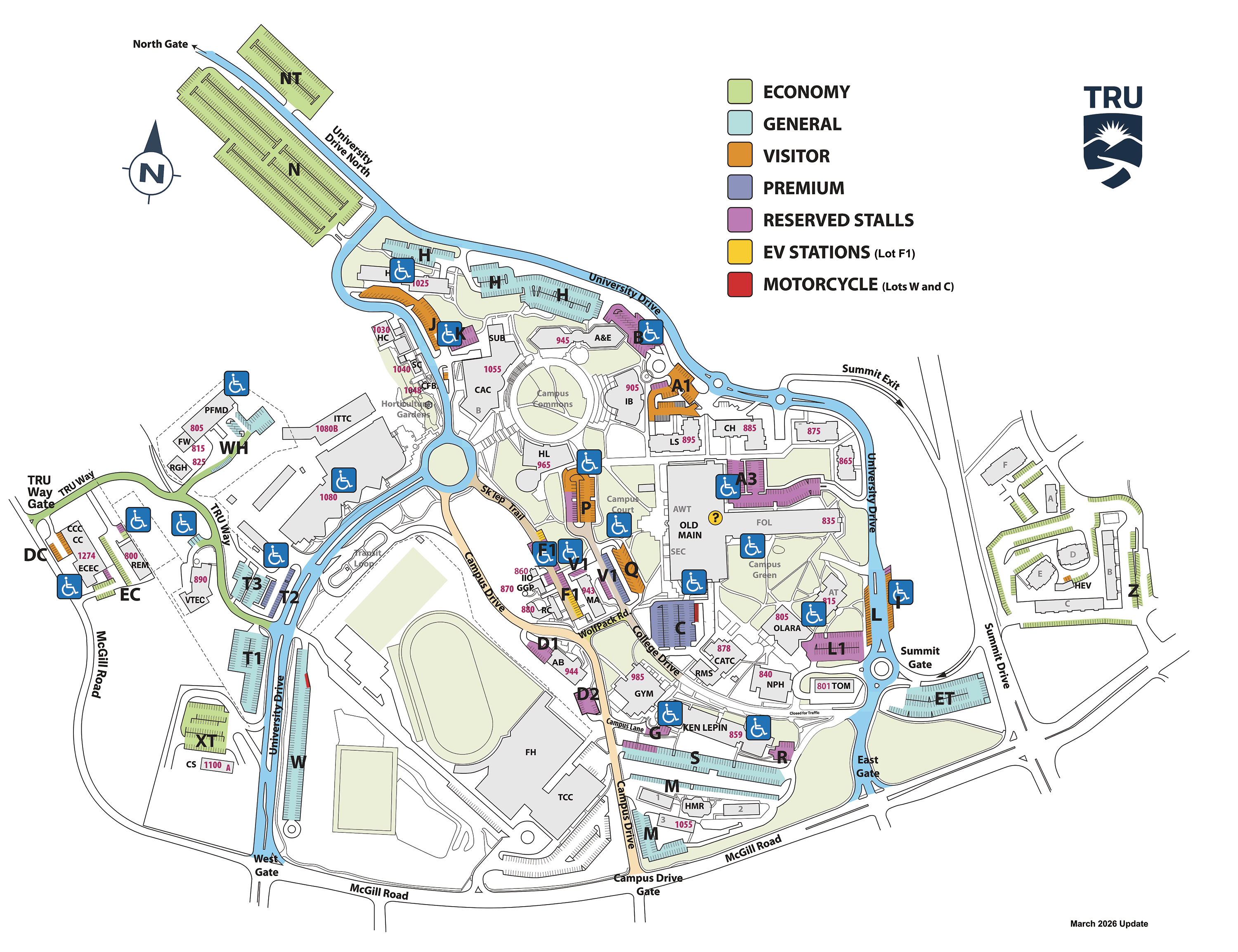 You must have a valid general lot rate parking permit. Either a general permit through the TRU-dedicated Online Permit Portal or for daily parking using the non-touch SMRTpass QR codes using your smart phone located in the specific lot (economy, general, visitor) where you are parking, or the SMRTpass QR code located at individual accessible stalls in premium and reserved lots, which are discounted to the general lot rate.